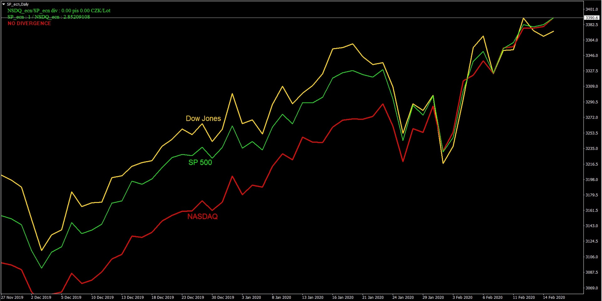 Srovnání aktuální ceny indexů NASDAQ, SP500 a Dow na společném denním grafu z 17. 2. 2020