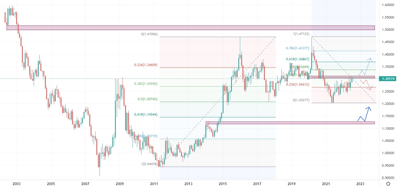 Americký dolar je v posledních měsících velmi silnou měnou, takže je průraz této rezistence poměrně pravděpodobný scénář. Pokud by se současná finanční a politická situace nakonec začala vyvíjet v jeho neprospěch, lze přepokládat pokles kurzu tohoto měnového páru až na cenu 1.125, kde se nachází výrazná supportní zóna.