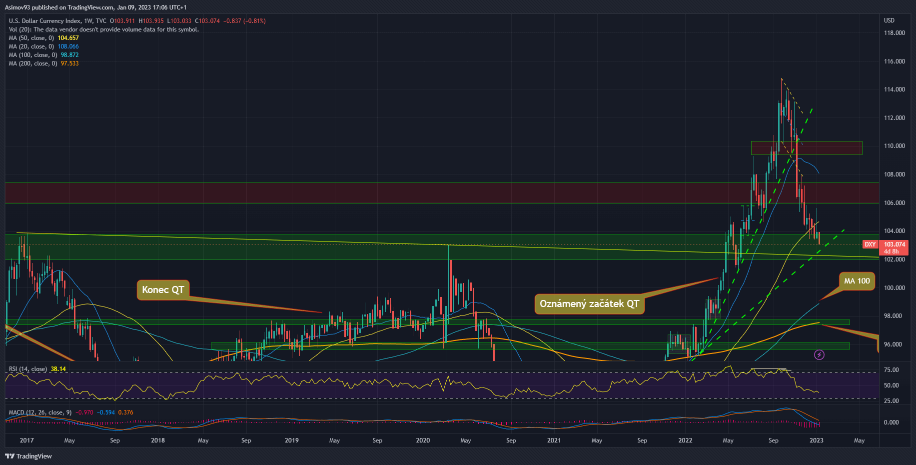 Komoditnímu trhu nyní kde kdo predikuje býčí trend. Do značné míry jsem to rozebral v poslední analýze na zlato. Nicméně ropa naopak klesá. Přestože americký dolar strmě oslabuje a od vrcholu z roku 2022 ztratil více jak 10 %. Momentálně dolarový index konsoliduje klíčový support a bude hodně zajímavé sledovat, jestli prodejní tlak ustojí.