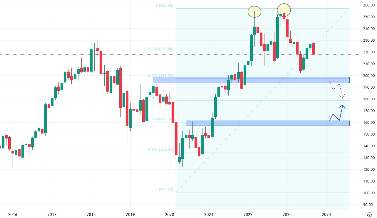 Akcie General Dynamics vytvořily technickou formaci dvojitý vrchol, jejíž cenová maxima vznikla vždy na přelomu posledních dvou let. Po vytvoření této formace akcie klesaly až na hodnotu nejbližšího supportu na ceně 200 USD. Hodnota supportu sice nebyla naplno testována, ale trh otočil směrem vzhůru v její těsné blízkosti. Z tohoto důvodu se může snížit její podpůrná schopnost a v případě dalšího testu může trh klesnout pod její hodnotu.