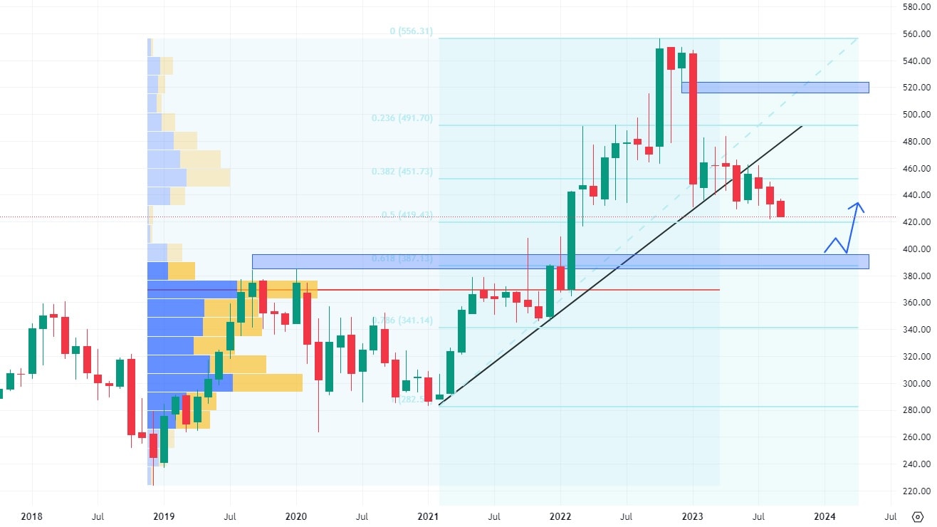 Akcie Northrop Grumman začátkem letošního roku prorazily hodnotu rostoucí trendové čáry, čímž se dostaly do klesajícího trendu. Nejbližší supportní úroveň se nachází na ceně 400 USD, kde vznikla konfluence s 61,8 % Fibonacciho retracementu. Pod touto cenovou zónou se také nachází silné volume, čehož akcie mohou využít minimálně ke zpomalení svého cenového poklesu.