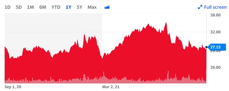 Vývoj ceny akcií Enterprise Products Partners za posledních 12 měsíců