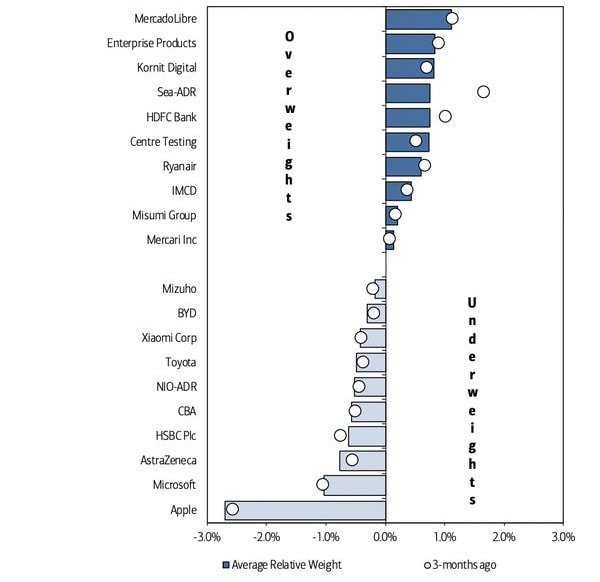 Apple a Microsoft pak byly v červenci celosvětově vůbec nejvíce podváženými akciemi – jejich podíl na celkově spravovaných aktivech fondů se snižoval.