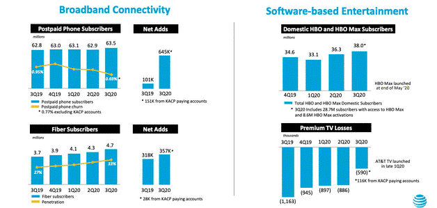 Počty nových předplatitelů HBO a HBO Max postupně rostou a aktuálně má tato služba 38 miliónů předplatitelů. Roste také počet uživatelů optického internetu (Fiber), kterých je 4,7 miliónů. Ve 3Q 2020 rovněž stoupl počet uživatelů telefonních linek na současných 63,5 miliónů.