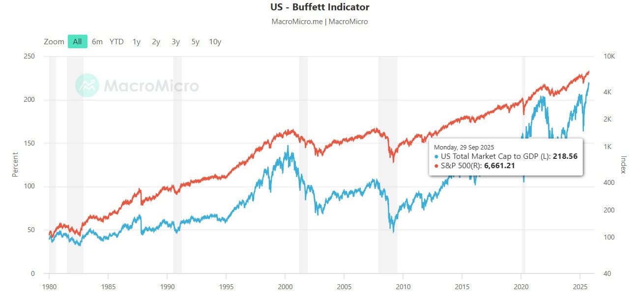 Warren Buffett se kdysi slavně vyjádřil, že pokud se hodnota indikátoru blíží 200 %, investoři si hrají s ohněm a hrozí tržní krach.