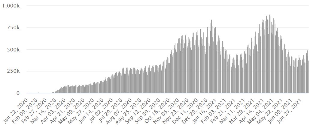 Denní počet nových případů onemocnění covid-19. Zdroj: worldometers.info