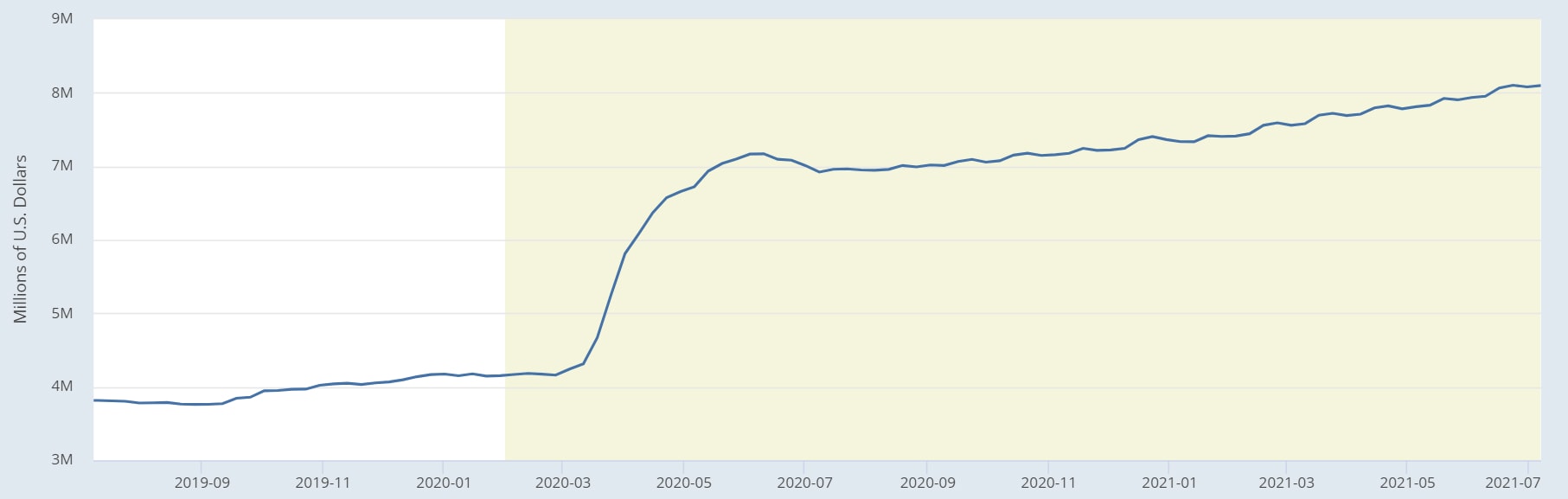 Růst velikosti bilance americké centrální banky za poslední dva roky. Zdroj: fred.stlouisfed.org