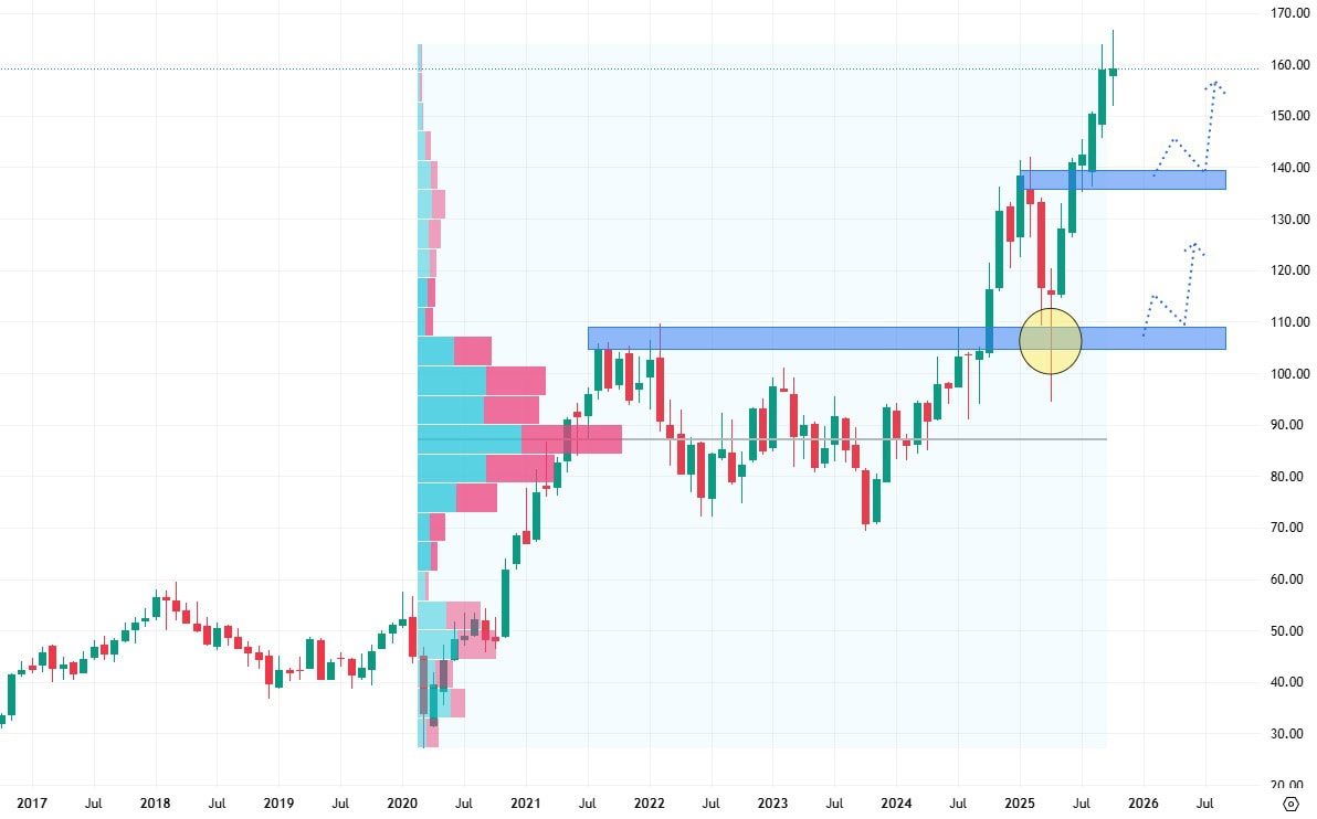 Zde je nejbližší support na úrovni proražených předchozích cenových maxim a je stále validní, protože ještě nedošlo k jeho testu. Pokud by si akcie provedly korekci může to být cena 140 USD, která je vrátí opět do růstového trendu.