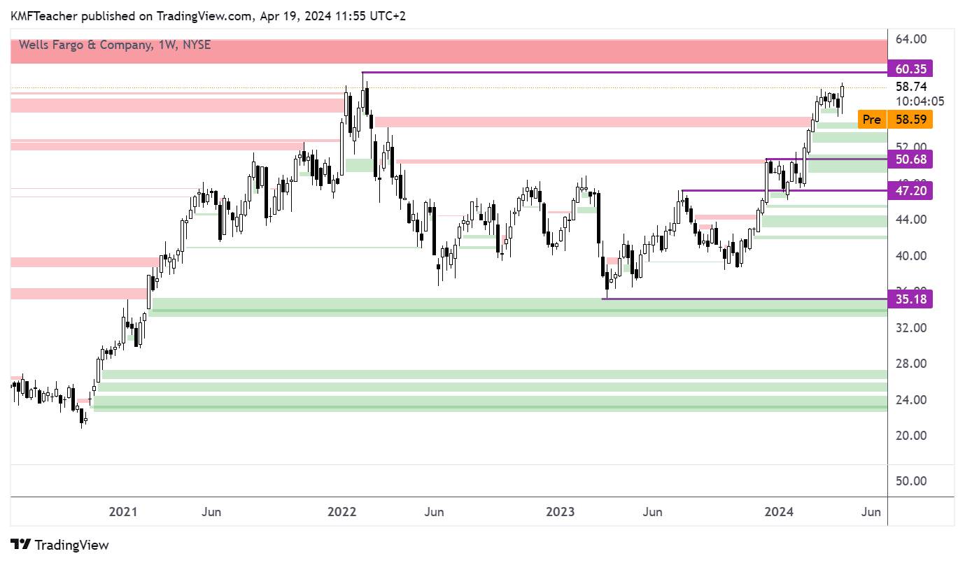 Akcie Wells Fargo na týdenním grafu