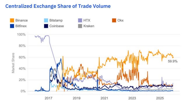 Data z 1. prosince 2025 ukazují rozdíl. Binance zpracovala 20 miliard dolarů v objemu a 61,9 milionu obchodů za jediný den. Konkurenční Coinbase ve stejný den zobchodovala 3,6 miliardy USD, OKX zhruba 3 miliardy.