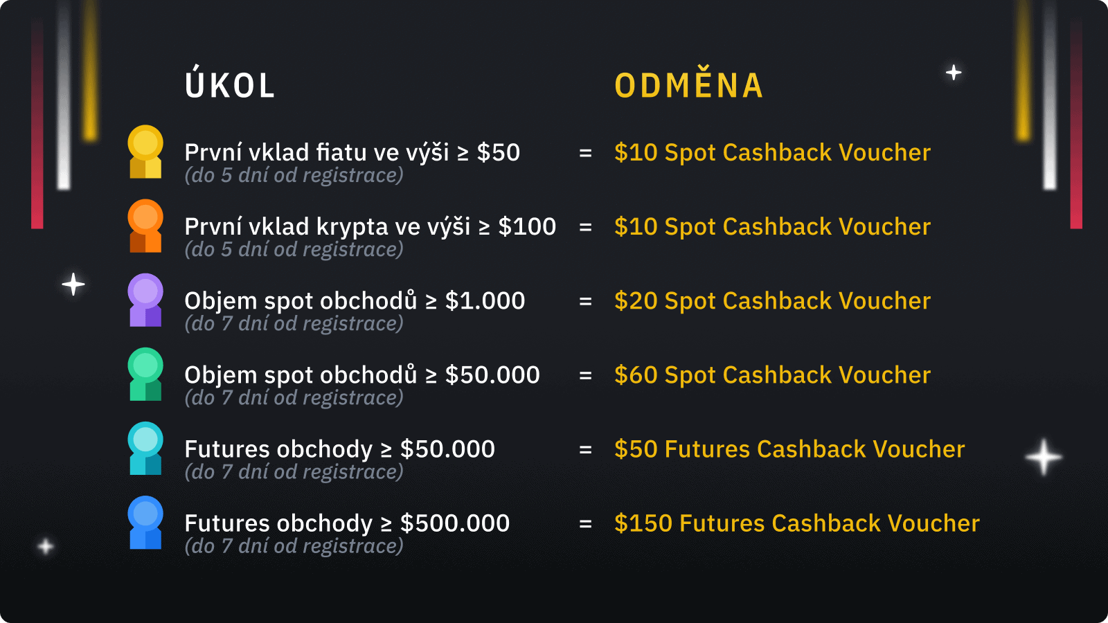 Při registraci nového účtu skrze odkaz výše můžete získat následují odměny ve formě cashback voucherů: