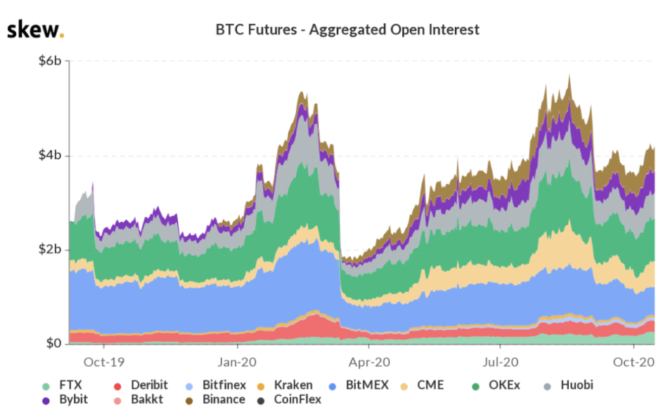 Další důležitou metrikou ve spojení s klesající volatilitou je tzv. open interest, což je celkový počet otevřených obchodních pozic. Tato metrika ukazuje zájem o aktivní obchodování BTC.