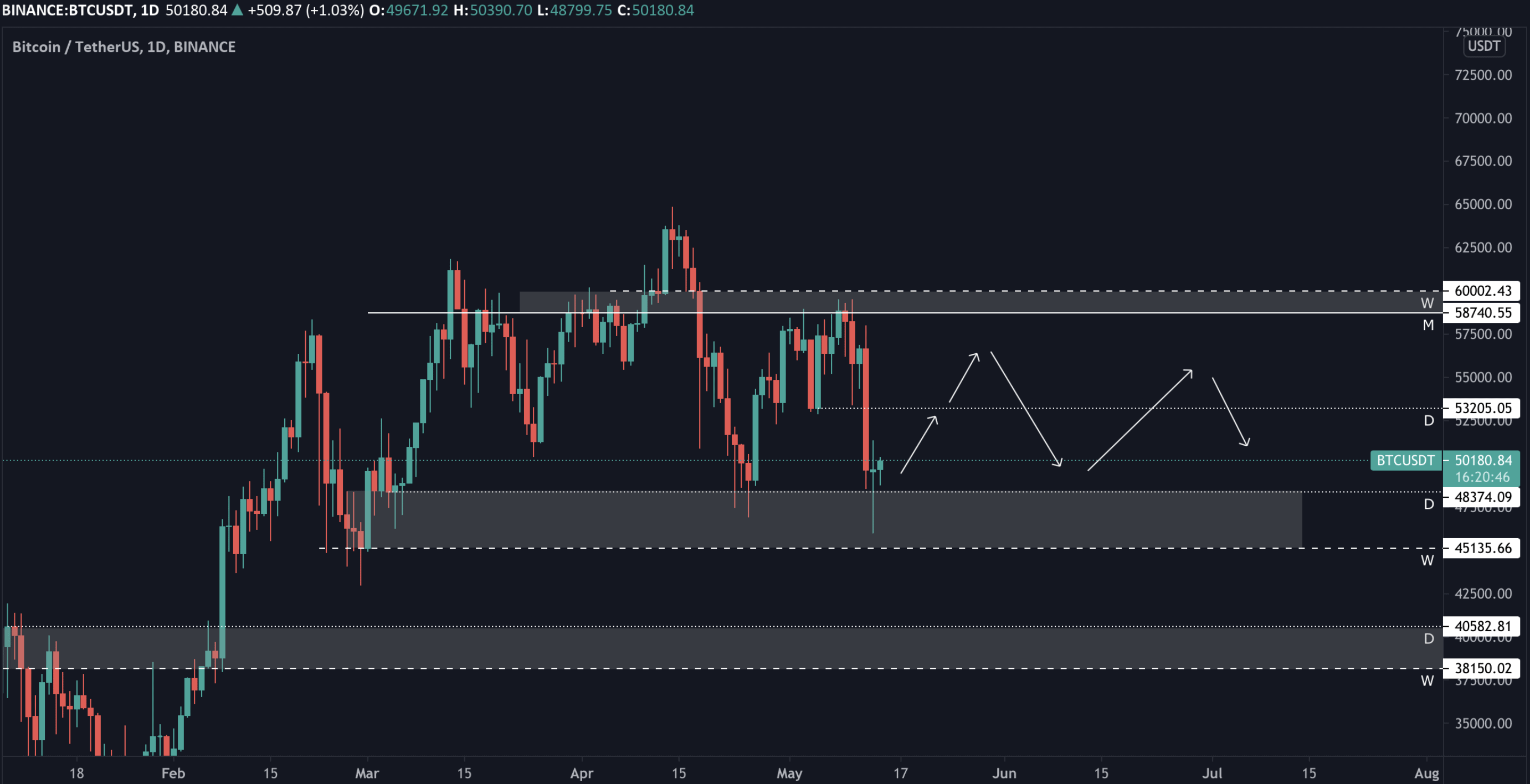 Na cenách 48-45 tis. vidíme velmi silný support, který jen tak prolomený nebude, takže to nejpravděpodobnější, co uvidíme na Bitcoinu v dalších dnech, bude odraz nahoru, minimálněna cenu 53 tis. USD, viz graf níže.