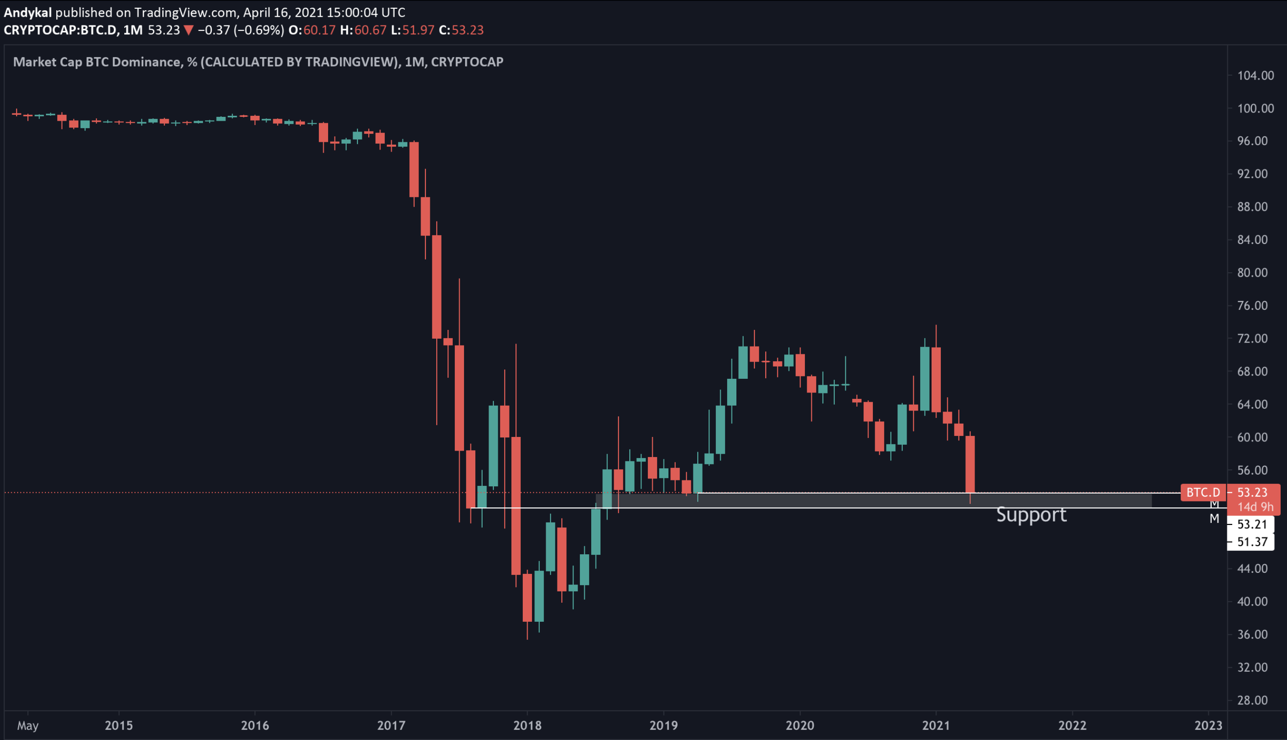 Důvod, proč ji zmiňuji je, že dominance Bitcoinu během dneška dosáhla velmi důležitý support z měsíčního časového rámce, takže pokud by měla někde přijít reakce nahoru, myslím si, že je to právě v těchto oblastech.