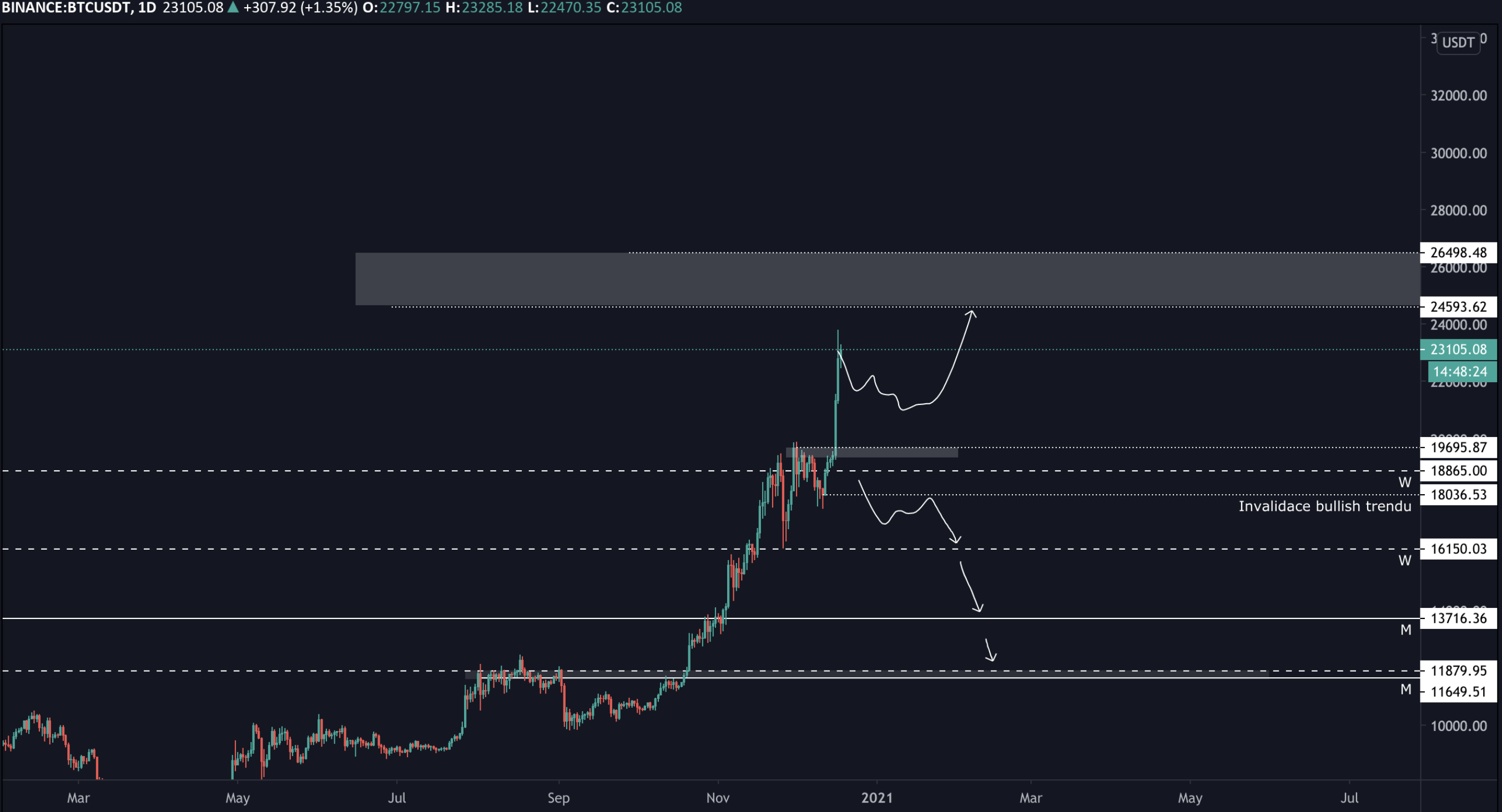 Jako vždy, i dnešní analýza začne tím, že ikdyž se nám může Bitcoin zdát “drahý”, tak technický uptrend pokračuje tak dlouho, dokud neztratíme poslední vytvořené minimum. V této chvíli jej máme na ceně 18 tis. USD.