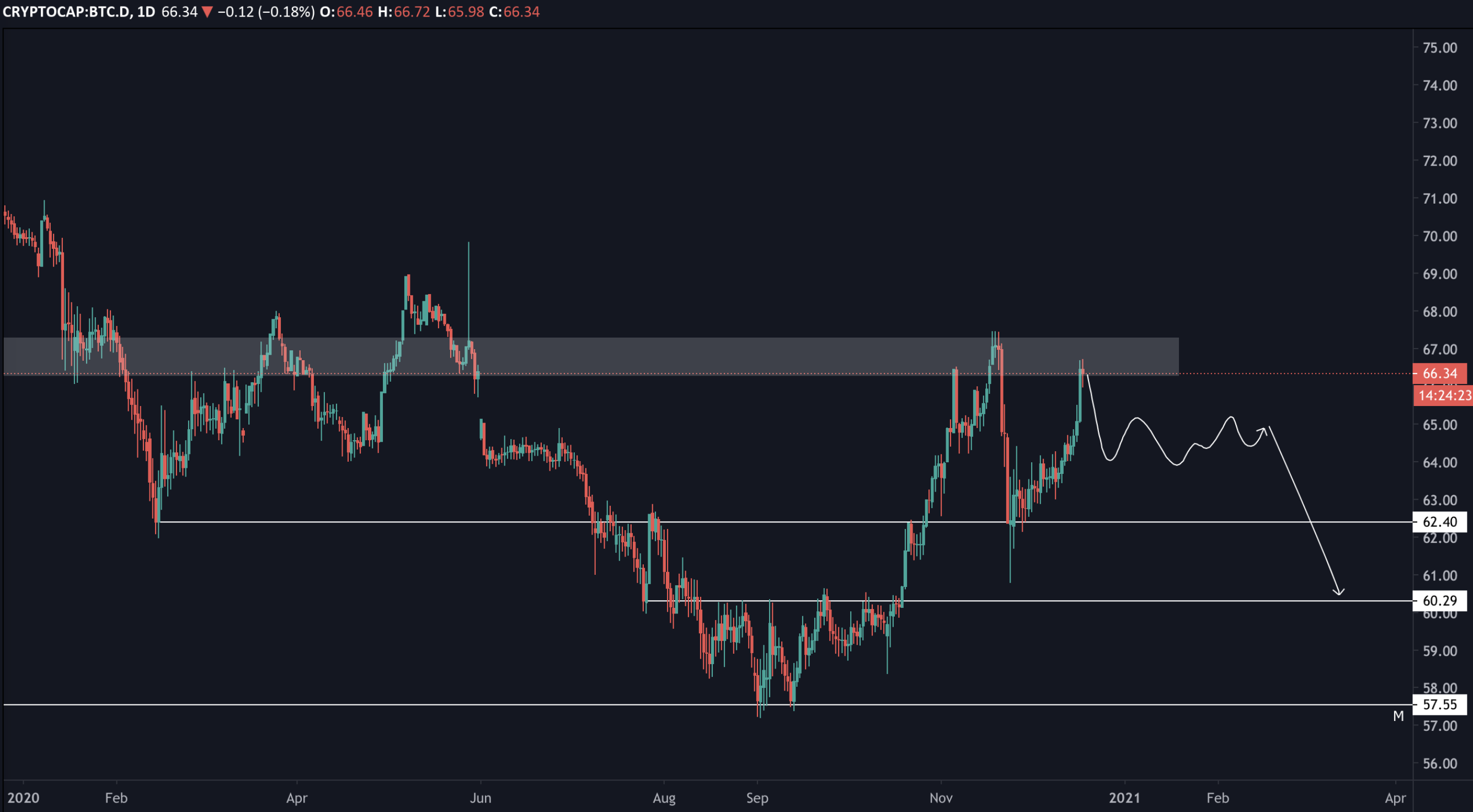 Ten samý pohled stále platí. Tím, že měl Bitcoin silný pohyb nahoru a altcoiny jej nestihly následovat tak silně, tak se pouze prodlužuje doba, kdy by měl scénář proběhnout.