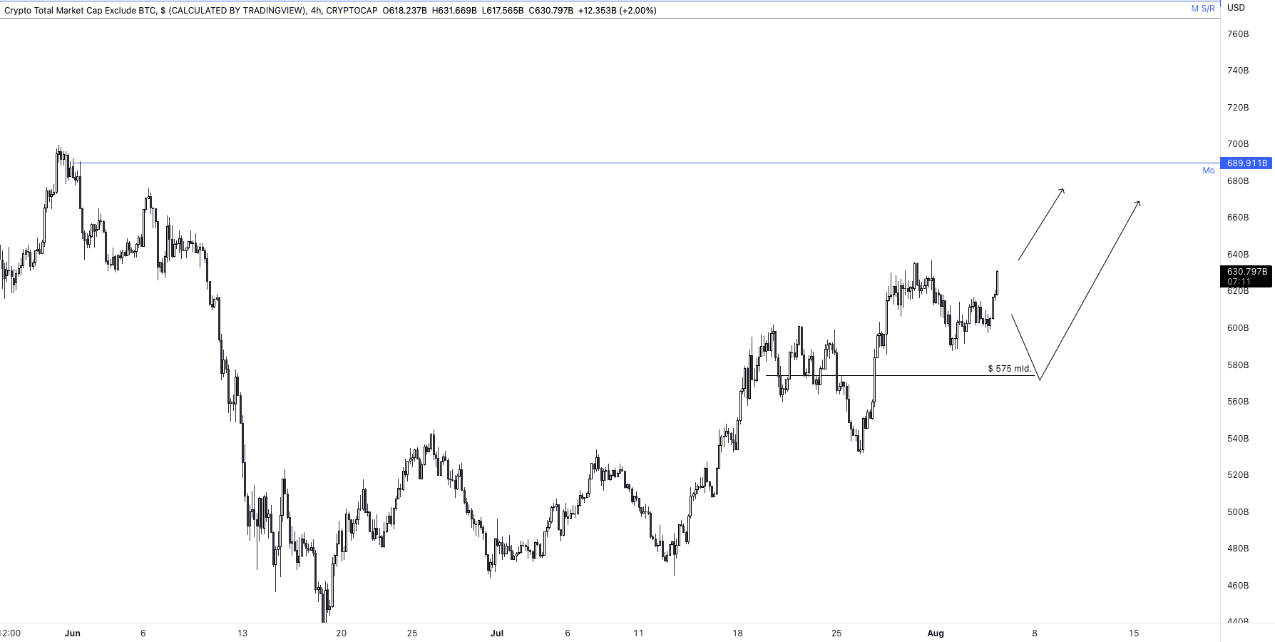 Níže vidíme graf Total market cap. 2, který označuje celkovou kapitalizaci altcoinového trhu. Altcoiny mají také ještě místo pro růst nahoru, cca k 690 mld. USD. Velmi podobně jako Bitcoin, mají i alty pod cenou také neotestovaný level, z něhož by byly nejlepší longové příležitosti.