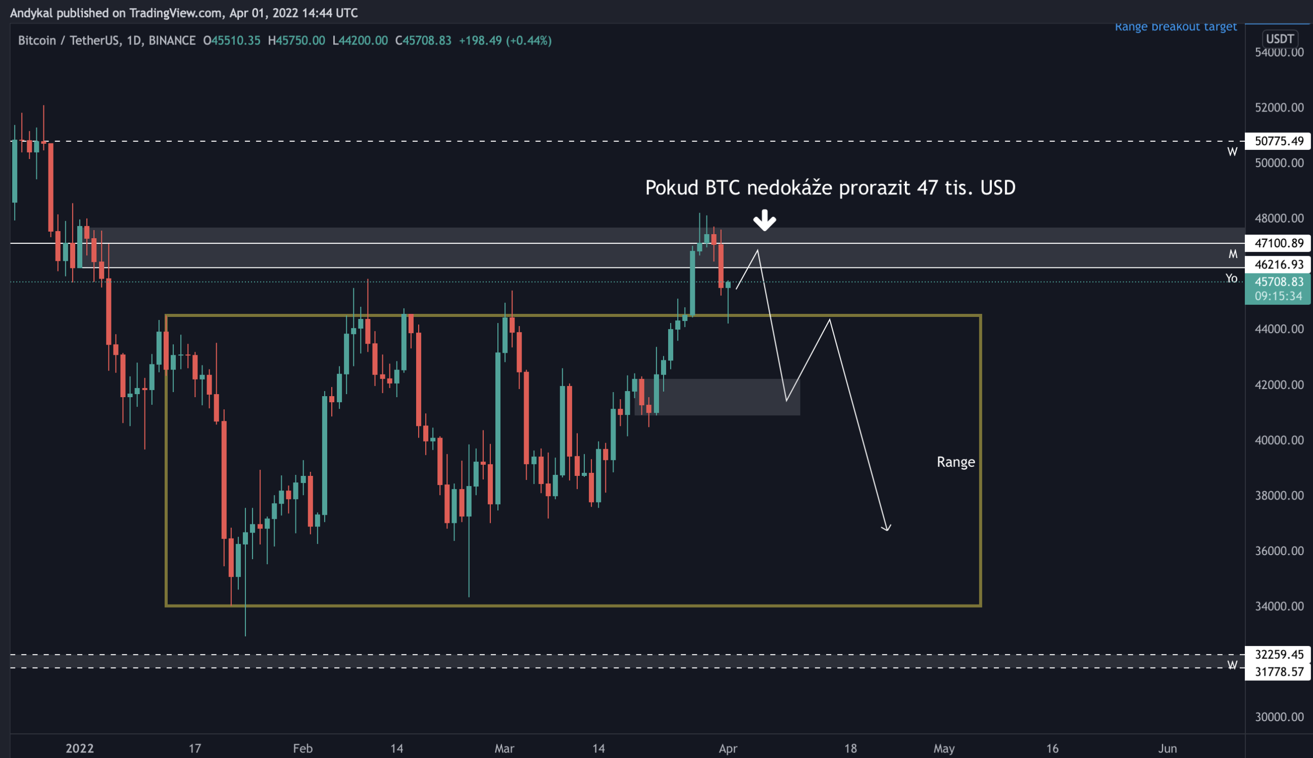 Je tu ale možnost, že celý pohyb na 48 tis. byl pouze odchylka v rámci toho stejného range, který trvá od začátku roku. To, že se pohybujeme v medvědím scénáři, poznáme podle toho, že by se BTC dostal a uzavřel den opět v rámci předchozího range.