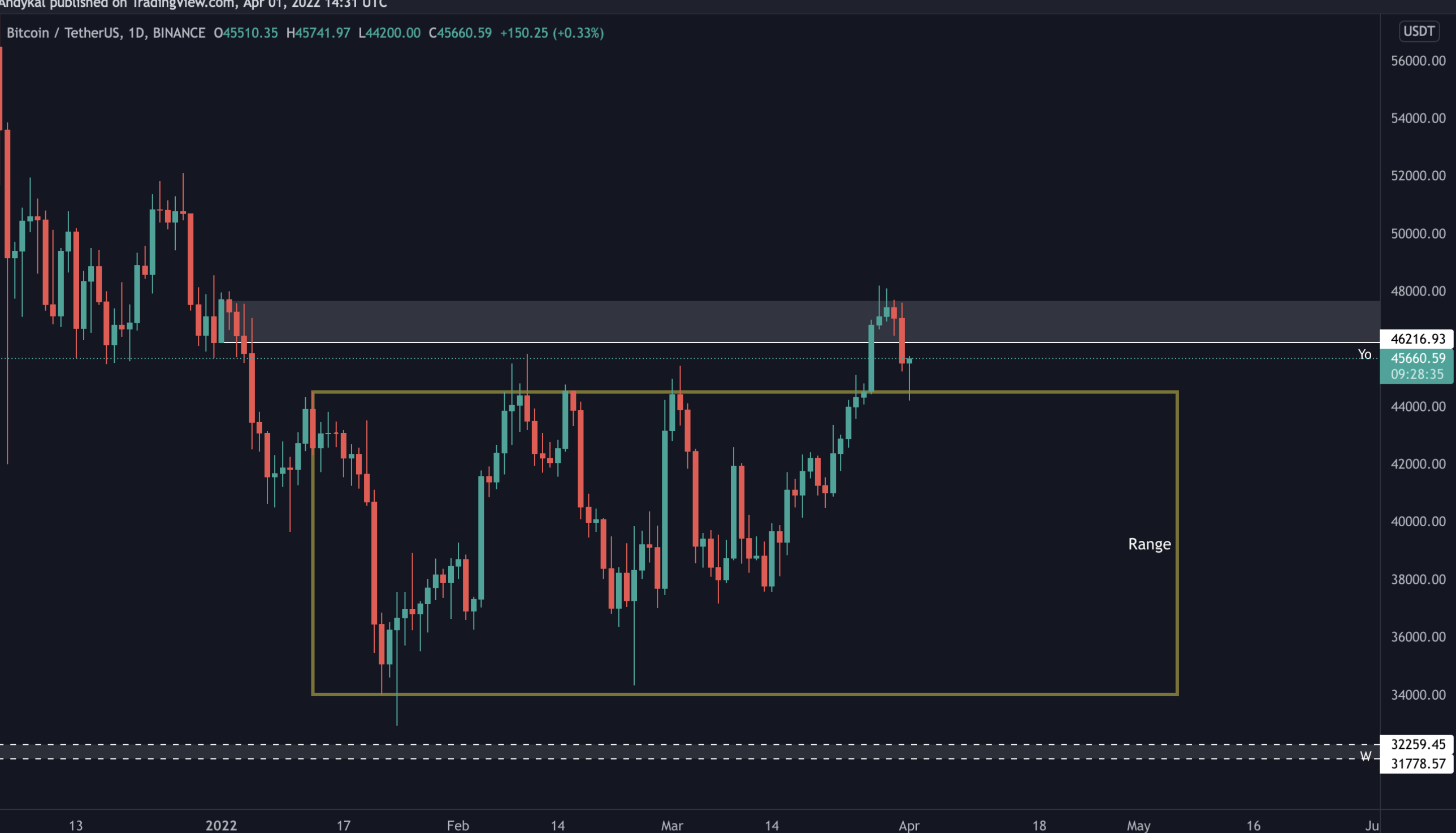 Nyní jsou prakticky jen dvě hranice, které mě zajímají. Jedna je 47 tis. USD, a pokud ji BTC překoná, pravděpodobně se pohybujeme v bullish scénáři a můžeme longovat.