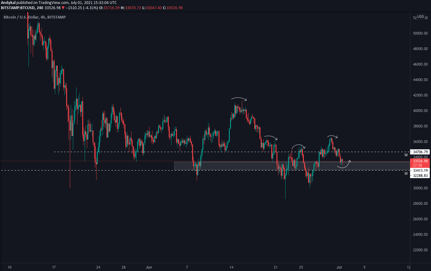 Aby mohl trend pokračovat, je tu jedna zcela jasná podmínka – Bitcoin musí udržet zónu 33400-32200 USD. Toto je ten nejzásadnější support ze všech, a pokud někdo sází na růst ceny Bitcoinu, toto je zóna, kde čekají jeho nákupní příkazy (případně jsou již vyplněné vzhledem k tomu, že jsme vrchní část zóny otestovali.