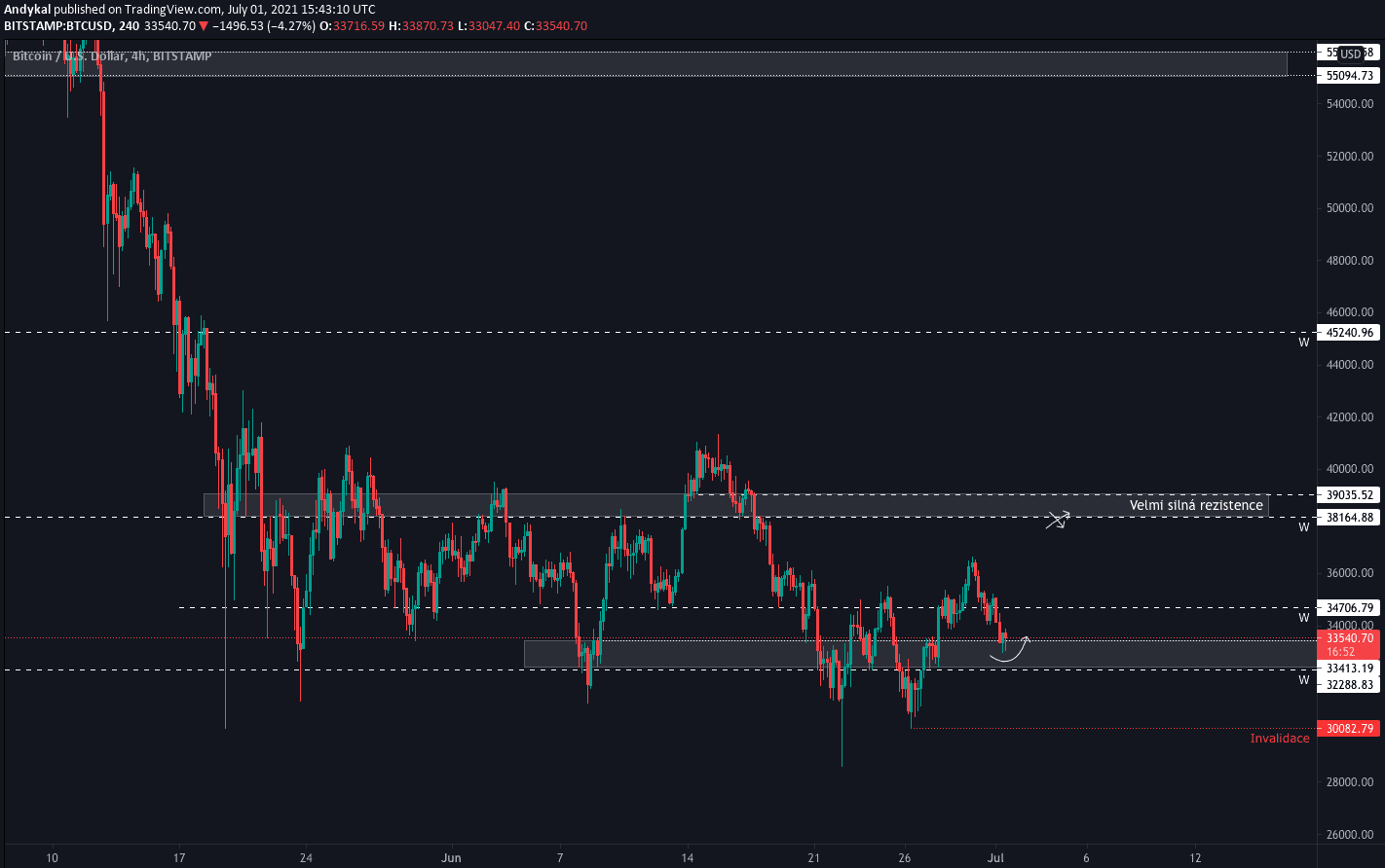 Nejdůležitější cenou je pro nás invalidační level pod 30 tis. USD, který by ukazoval, že Bitcoin není dost silný na pohyb vzhůru k rezistencím a že nás čeká spíše velký pohyb dolů, na 24 tis. USD, případně ještě níže.