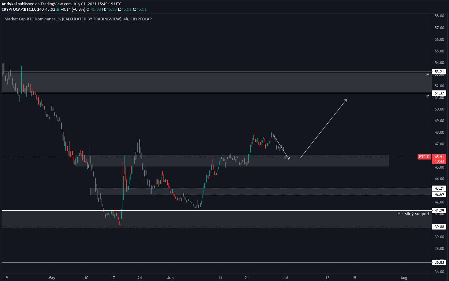 Bitcoinová dominance si stále drží svůj trend a právě nyní testuje důležitý support. Pravděpodobnější je, že tento support udrží a v dalším týdnu uvidíme pohyb k hlavní rezistenci, tedy k 51-53%, což by znamenalo pohyb o cca 5-7 procentních bodů výše.