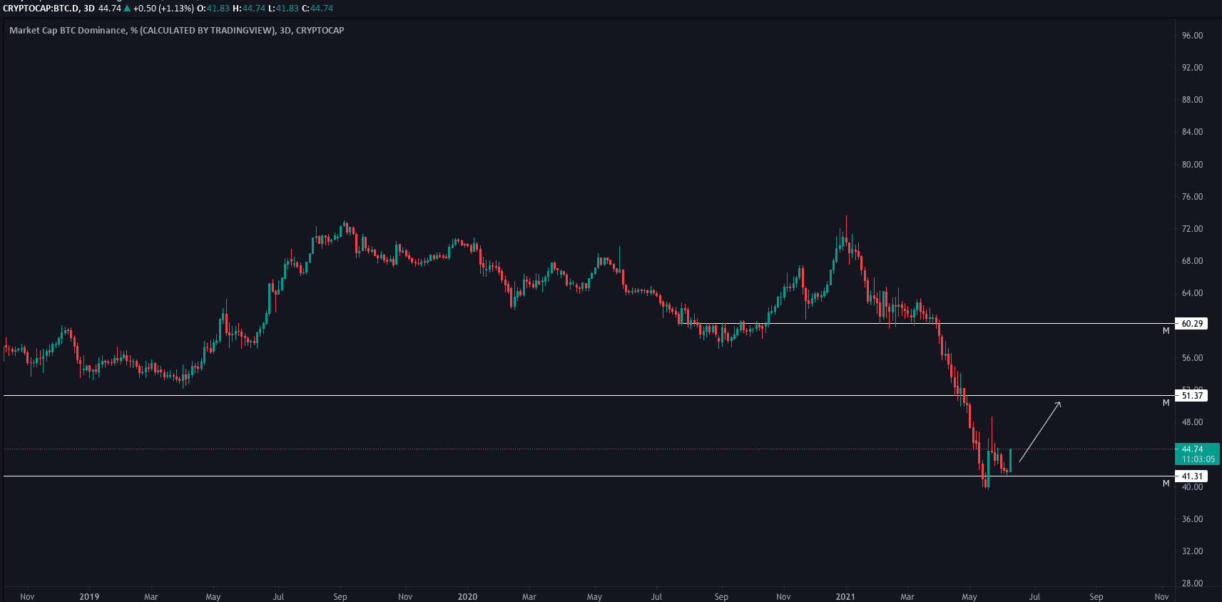 Dominanci BTC ve svých analýzách zmiňuji už nějakou dobu s tím, že leží na velmi důležitém supportu a to nejlogičtější, co zde můžeme čekat, je cesta nahoru, a to pravděpodobně až na 51%, což by od aktuální hodnoty znamenalo nárůst o téměř 7 p.b.