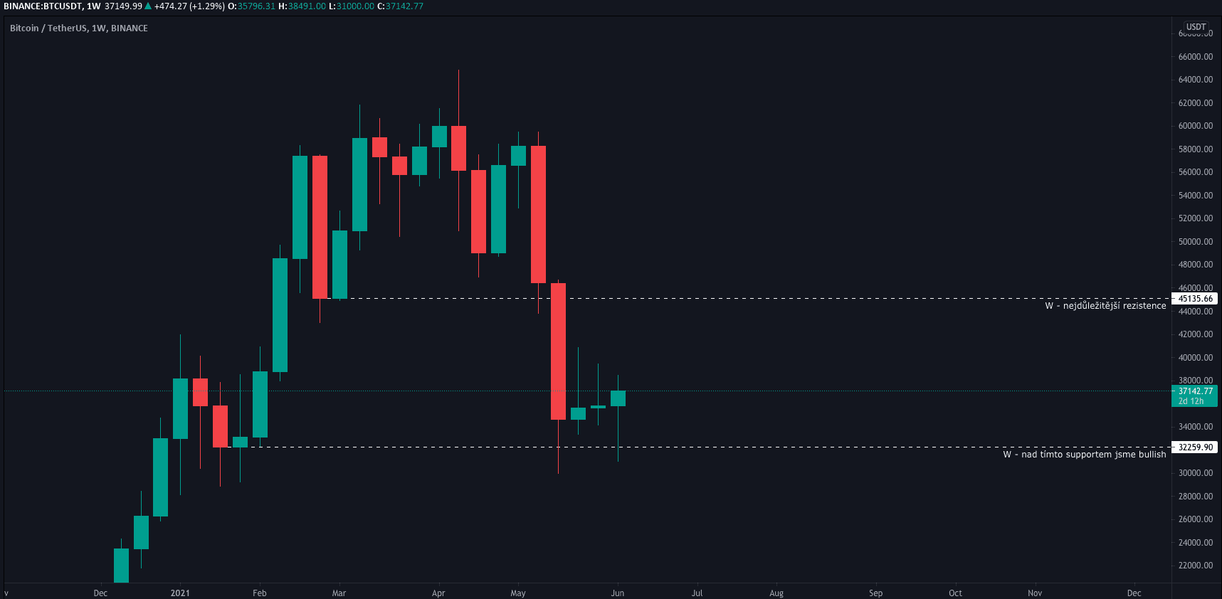 Jak už bylo zmíněno v předchozích analýzách, hlavní support na týdenním grafu je cena 32 250 USD. Dokud uzavírají týdenní svíce nad touto hladinou, můžeme očekávat pullback nahoru, k rezistenci 45 tis. USD.