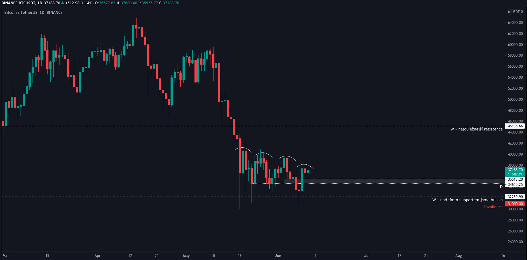 Nejdůležitější nákupní úroveň leží na cca 35 500 – 34 500 USD a invalidace pod low z úterního pohybu, tedy 31 000 USD.
