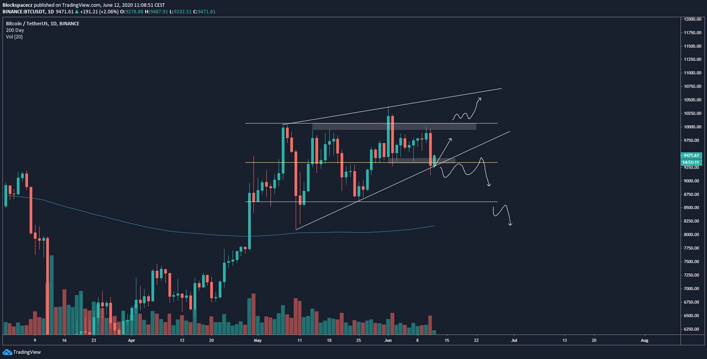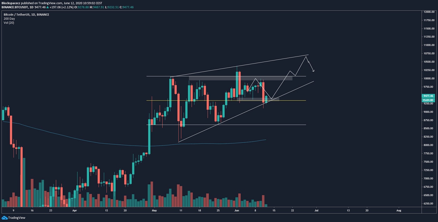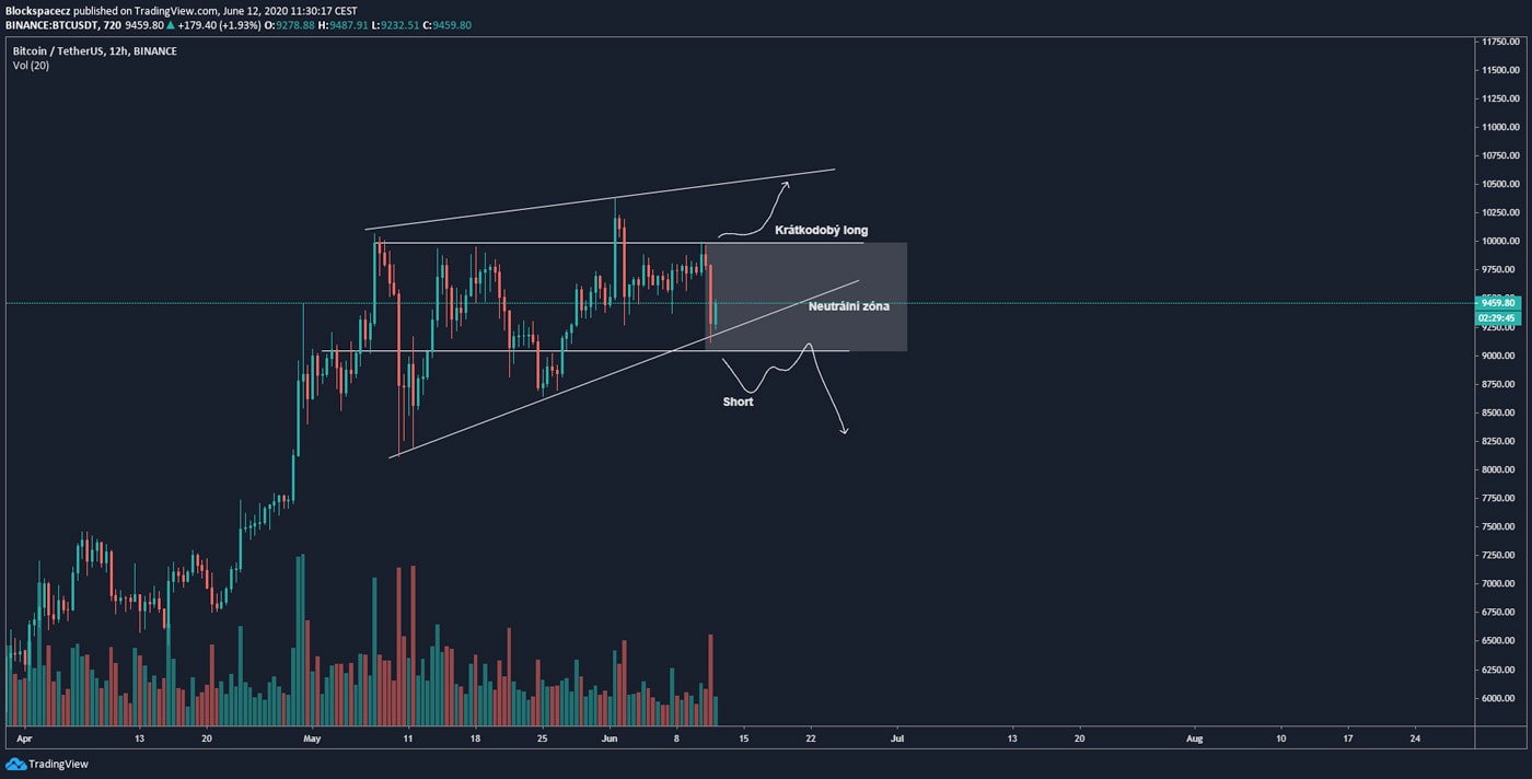 V této chvíli je to na Bitcoinu opravdu jednoduché – dokud cena zůstává nad supportní linií rising-wedge, tak ano, scénář je platný a je možné očekávat další nárůst ceny až k 10 500 – 10 600 USD.