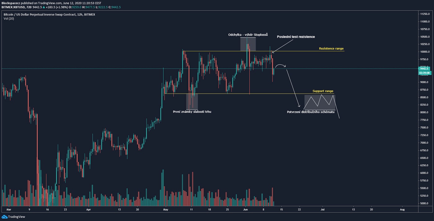 Jak jsem zmínil výše, je tu i možnost, že vrchol jsme již viděli na ceně kolem 10 400 USD. Argument pro toto tvrzení by byla metoda distribuce dle RIcharda Wyckoffa.