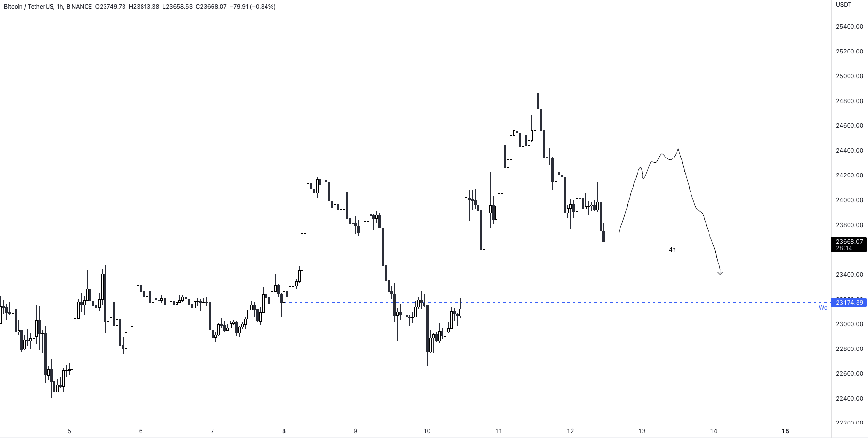 Když se podíváme na kratší časové rámce, vypadá to, že nějaká pokračující korekce nás stále může čekat, protože cena nezvládla překonat předchozí maximum, nyní ztratila strukturu na 1h grafu a i pokud z nynějšího supportu, který cena dosahuje, dostaneme bullish reakci, pravděpodobně bude krátkodobá a přijde retracement až k týdenní open ceně lehce pod 23200 USD.