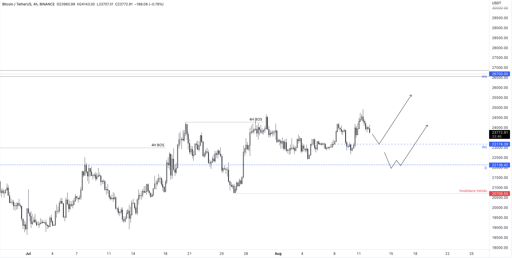 invalidace této teze zůstává také stejná – a to pokud by kurz bitcoinu uzavřel 4h svíci pod cenou 20 700 USD.