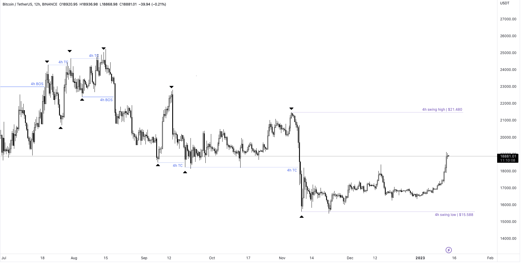 Když se díváme na 4h graf, je tu velmi solidní range mezi 18 400 – 16 250 USD. Pokud má BTC potvrdit celkový HTF bearish scénář, je třeba, aby se cena dostala zpět pod 18 400 a ideálně propadla i pod 17900 USD, kde by došlo k rozbití lokální bullish struktury.