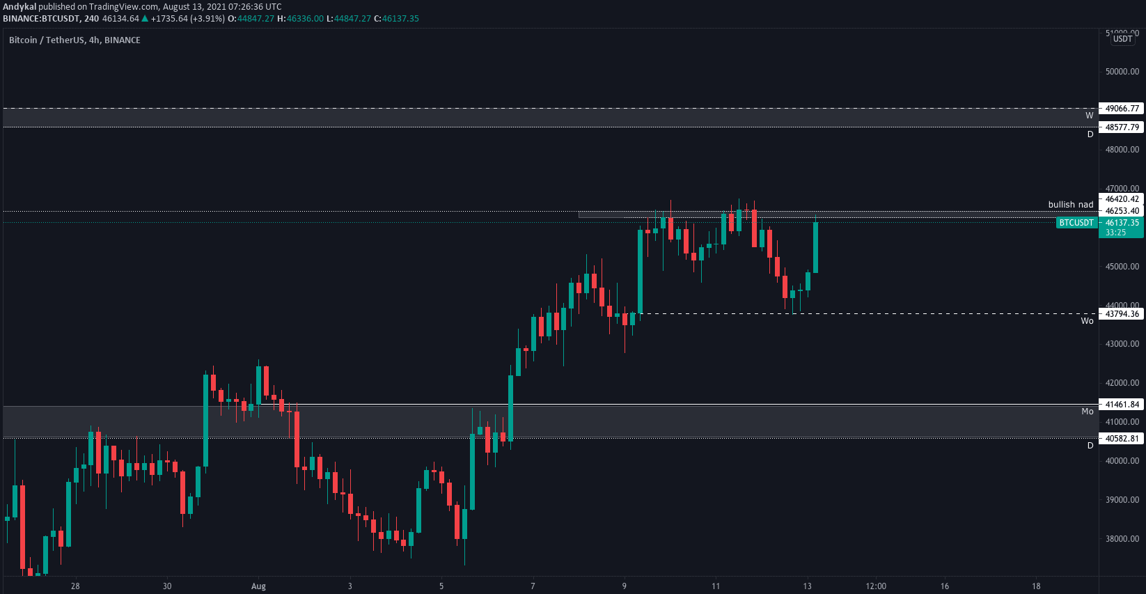 Nejdůležitějším supportem byl vyznačený týdenní level na ceně 43 800 USD. Bitcoin dokázal udržet support a dnes ráno vidíme velmi silné pokračování opět až k rezistenci 46 300 USD. Bitcoin tedy potvrzuje, že stále zůstává v uptrendu a dokud drží včerejší low, můžeme vidět nová lokální maxima.