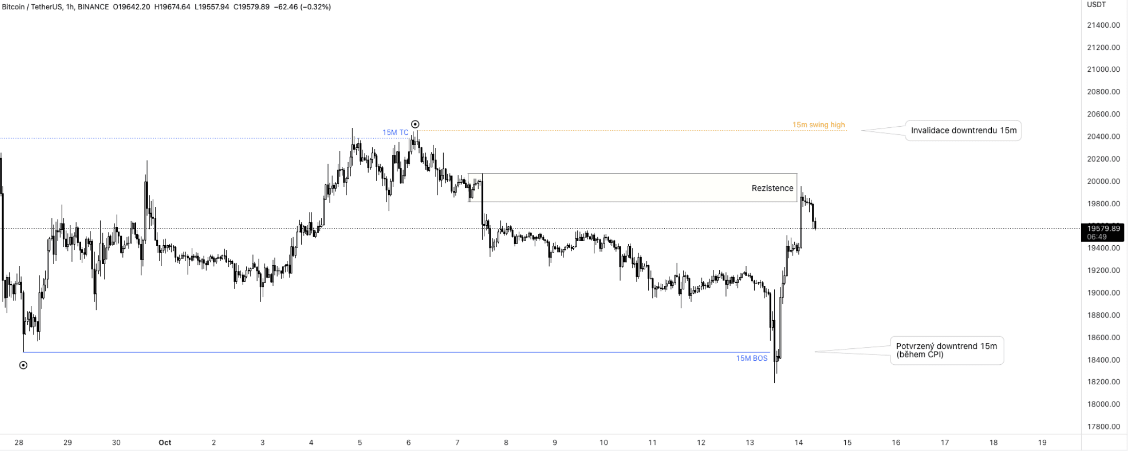 Včerejší prvotní pohyb dolů během CPI, který překlopil i 15m graf do downtrendového režimu, ale dává důvod k pochybám, jestli reálně BTC dokáže jít na 21 300 USD. Na grafu níže vidíme začátek downtrendu a dnešní pullback do rezistence.