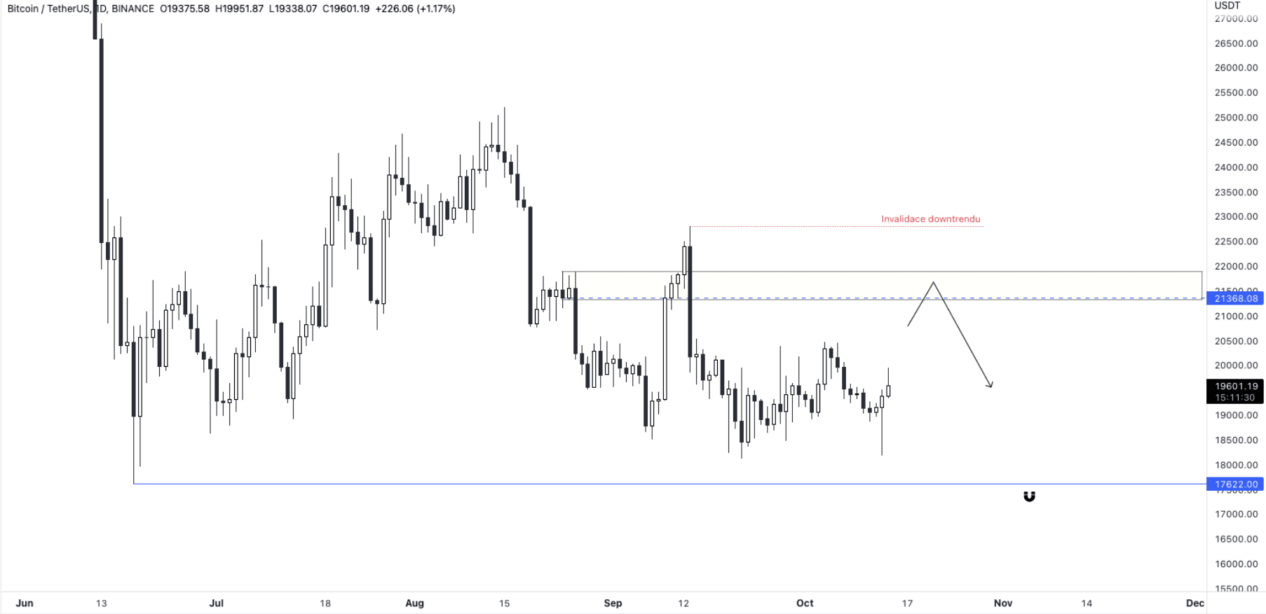 Invalidace celého downtrendu se nachází na cenové úrovni 22 800 USD. Pokud By BTC překročil tuto cenovku, bude otevřená cesta pro pohyb ceny na 25 000+ USD.