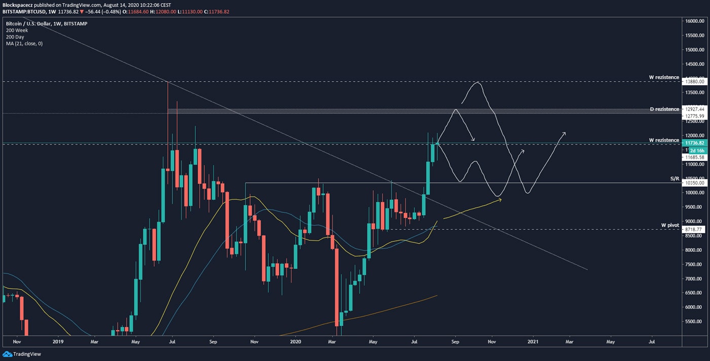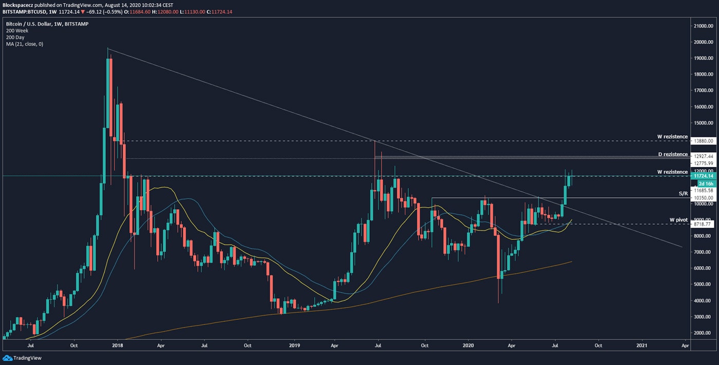 Další důležitou úrovní, se kterou Bitcoin aktuálně bojuje nejvíc, je týdenní rezistence na ceně 11 685 USD. Pokud by tato rezistence byla proražena nahoru, velmi pravděpodobně uvidíme další výstřel Bitcoinu směrem k rezistenci 12775-13000 USD a finálně až k 13880 USD, což by byl poslední target před korekcí ke zmíněným klouzavým průměrům. (aktuálně na 9tis. USD).