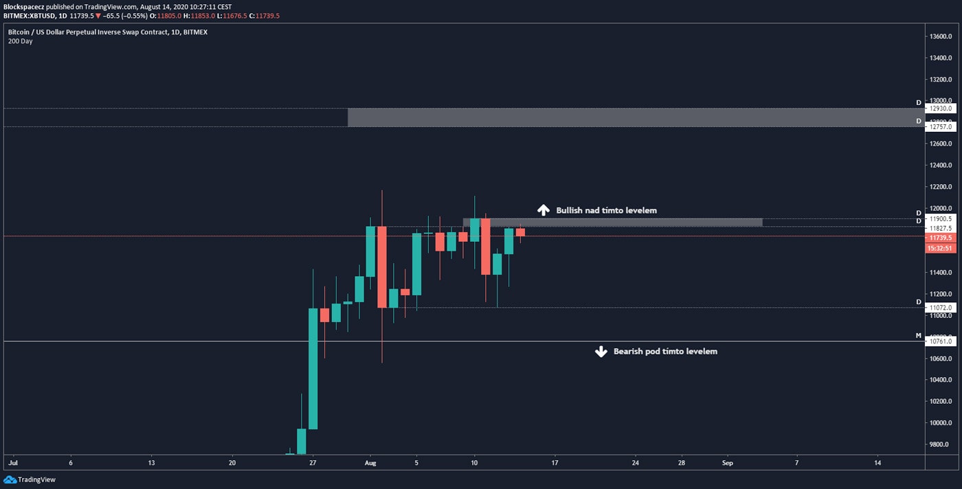 Bearish level zde mám označený až 10 761 USD pro plné potvrzení. Reálně ale pokud uzavřeme denní svíci pod 11 tis USD, by měl být bearish scénář aktivovaný.