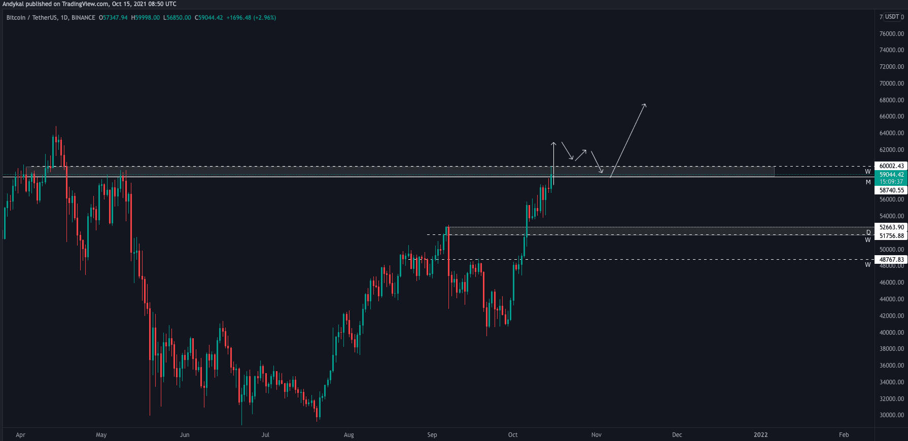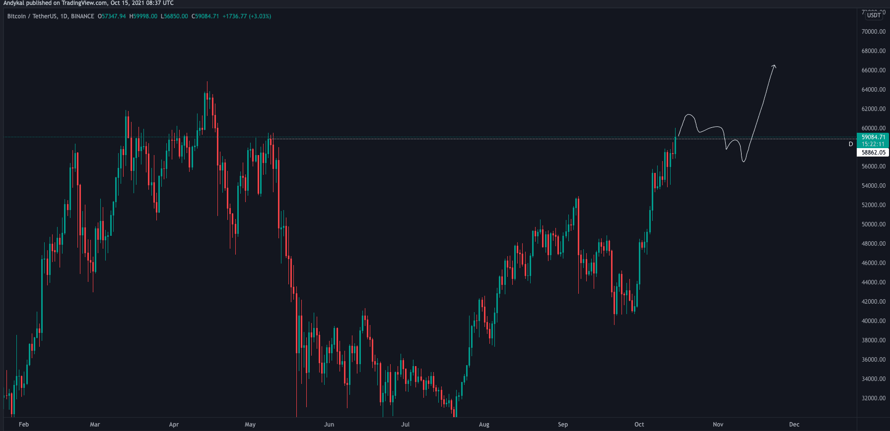 Jak vidíme z obrázku, swing high (uzávěrem denní svíce) je na hodnotě 58 862 USD. Pokud tedy uzavřeme denní svíci nad tímto levelem, Bitcoin by opravdu měl mít vyhráno a s větší či menší korekcí postoupit na nová ATH.
