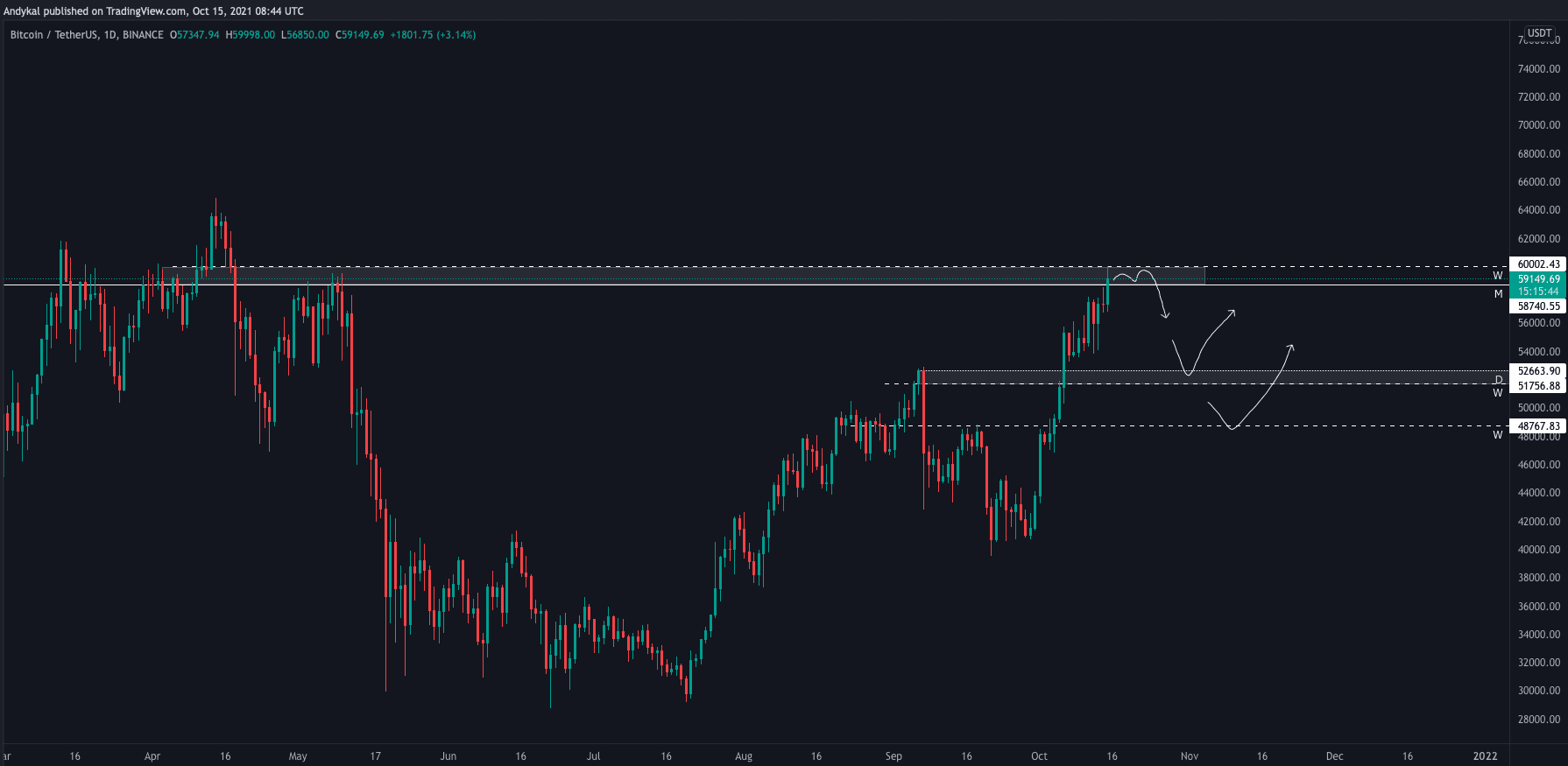 Samozřejmě je možné, že Bitcoin bude ultra-bullish a uvidíme proražení rezistence rovnou. poté by bylo možné použít aktuální rezistenci (60 tis- 58,7 tis. USD) jako support, který by měl Bitcoin odrazit na nová maxima. Toto v téhle chvíli zůstává ale méně pravděpodobnou variantou.