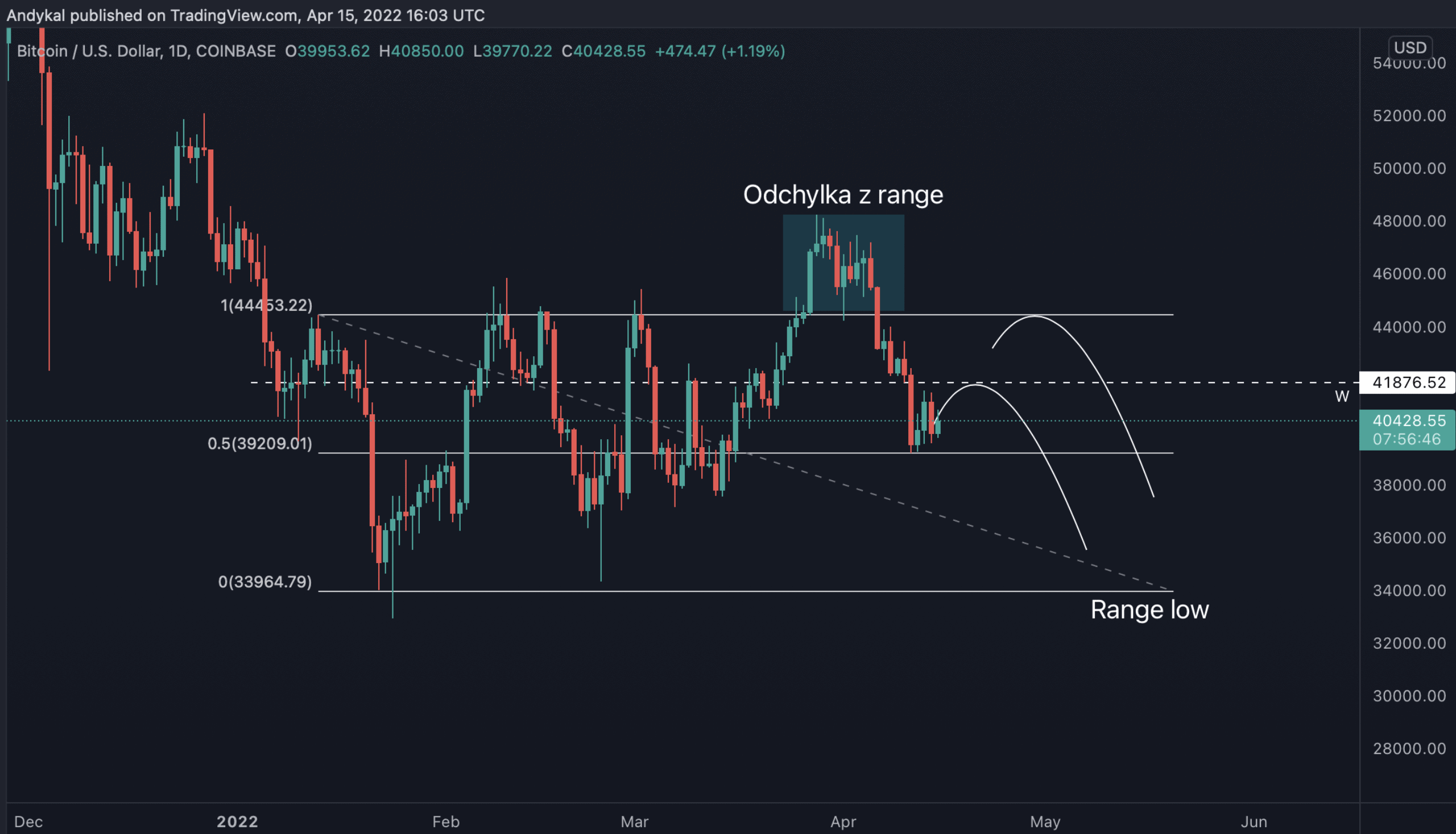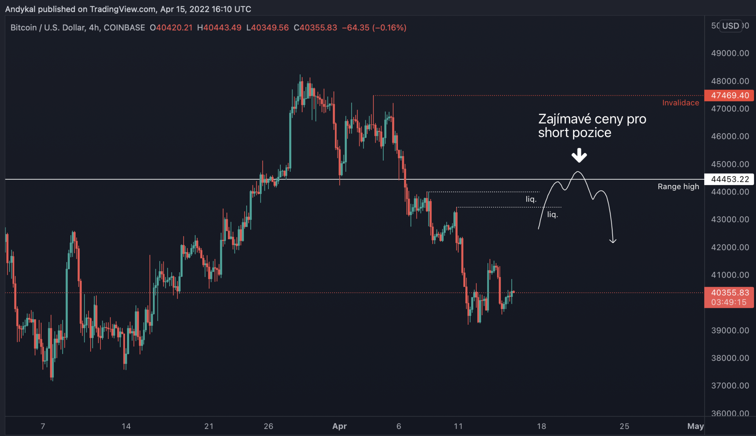 Pokud tento pullback má proběhnout, může se to stát z aktuálních cen, ale obchodně nejzajímavější by pro mě byl scénář, při kterém by BTC dosáhl range high na úrovni 44 500 USD. Toto jsou ceny, kde shorty začnou být extrémně zajímavé.