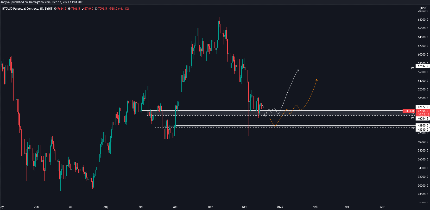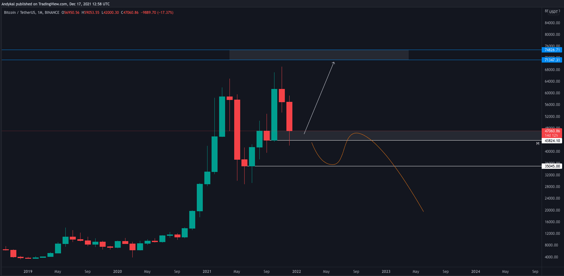 Co přesně tím myslím, můžete vidět na obrázku níže, který je z minulé analýzy. Dva scénáře, vše záleží pouze na tom, aby měsíční svíce neuzavřela pod 43 800 USD.