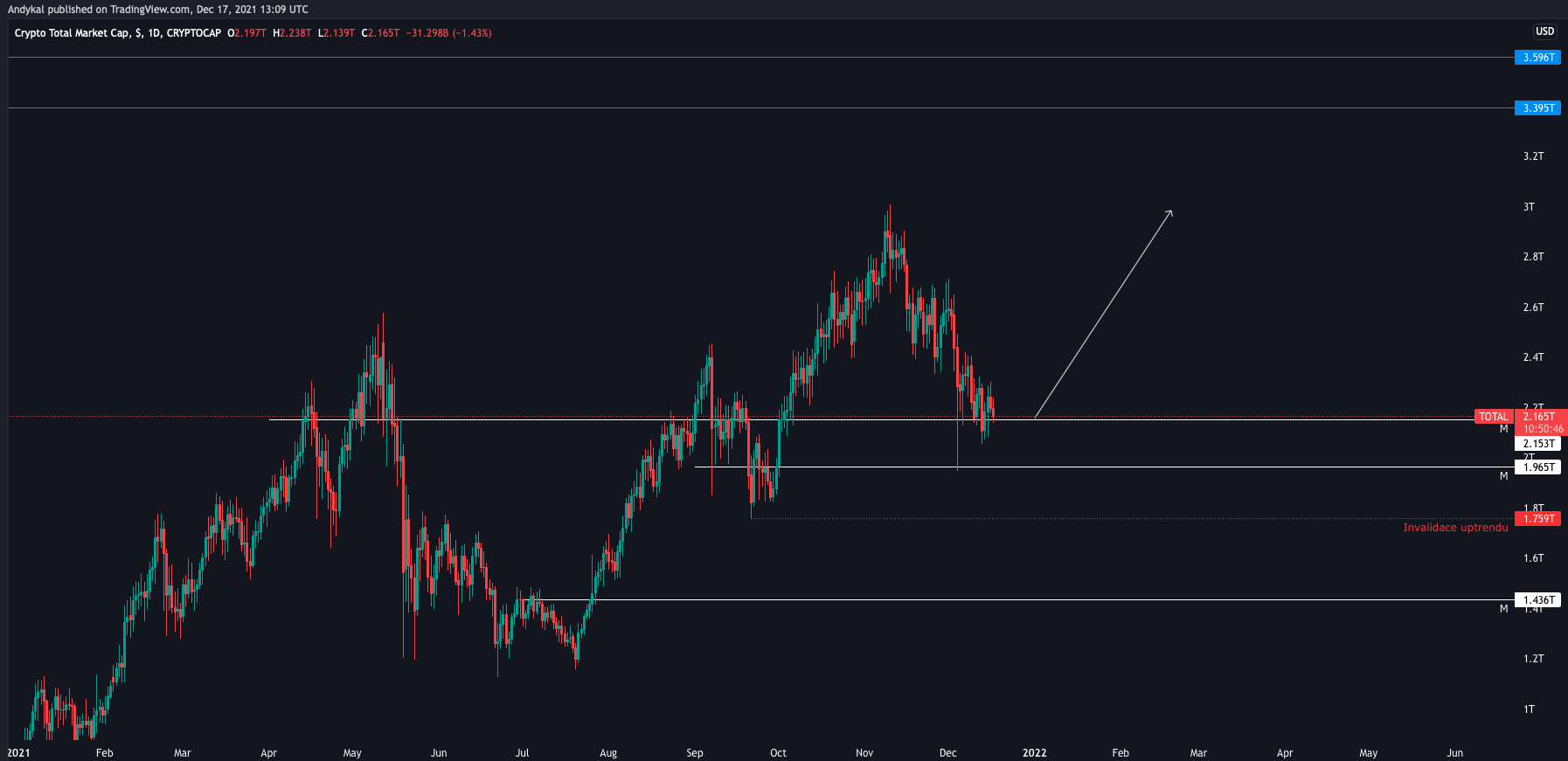 Celková kapitalizace kryptoměn vypadá podobně, byť o něco více pozitivně než Bitcoin. Také testuje jeden ze dvou silných supportů, které určují pokračující uptrend. Tyto supporty jsou: