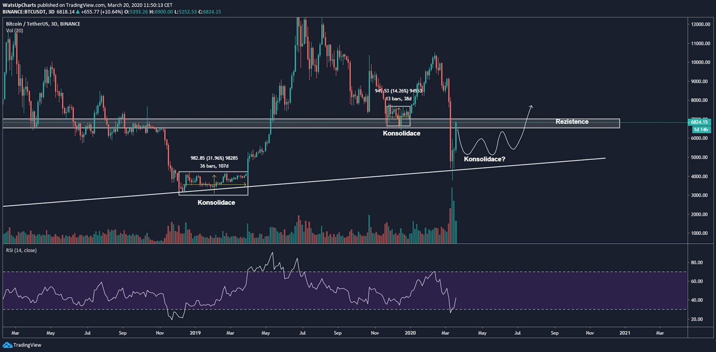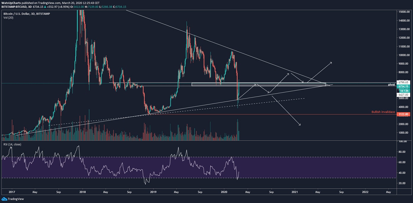 Ahoj tradeři, v minulé analýze jsme se bavili o tom, že od BTC můžeme očekávat návrat k hodnotám kolem 6 500 USD. Tyto úrovně (konkrétně zóna mezi 6 427 USD a 6 799 USD na Bitstampu) jsou pivotním levelem obrovského trianglu, který jsem ukazoval v minulé analýze.