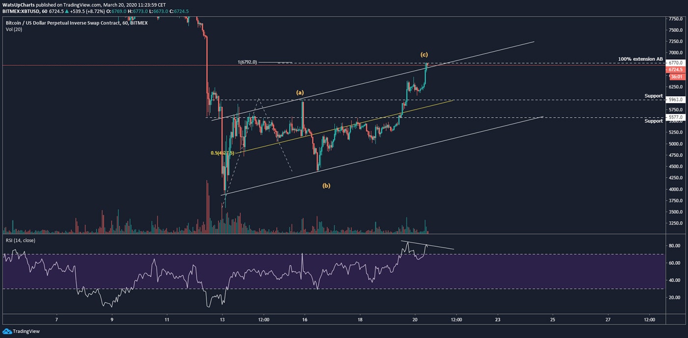 Pokud by se tedy stalo, že denní svíce uzavře nad 6 800 USD, tak velmi pravděpodobně můžeme očekávat postup na rezistenční trendovku trojúhelníku, a tedy na ceny kolem 9-10 tis. USD.