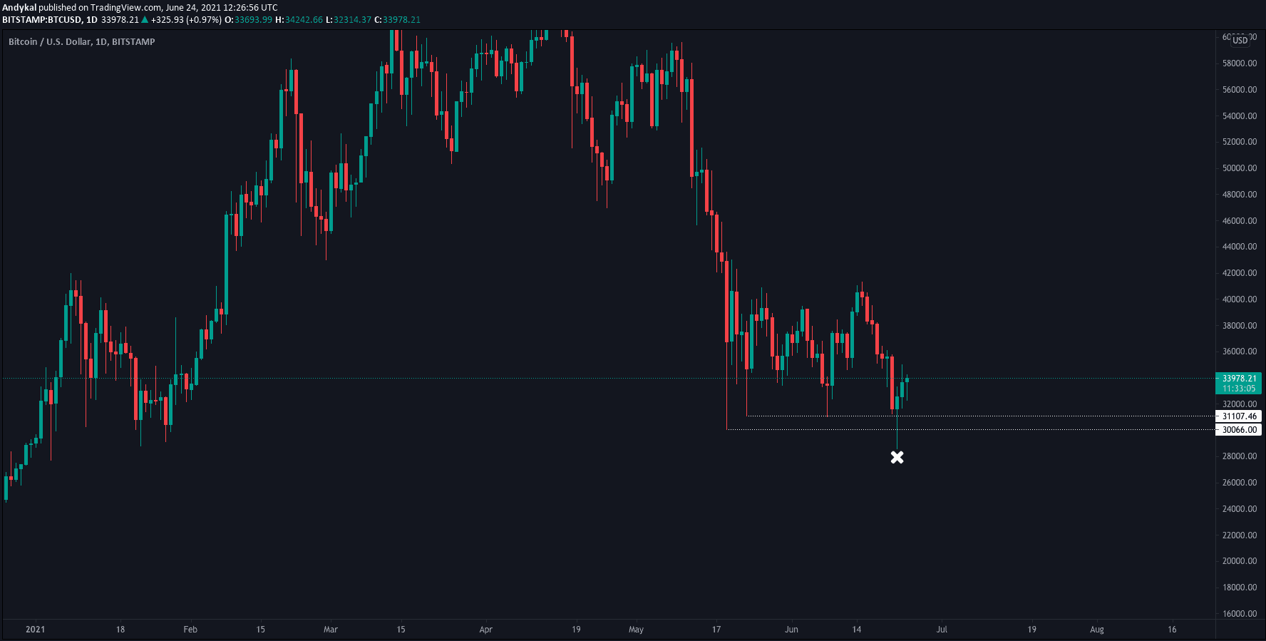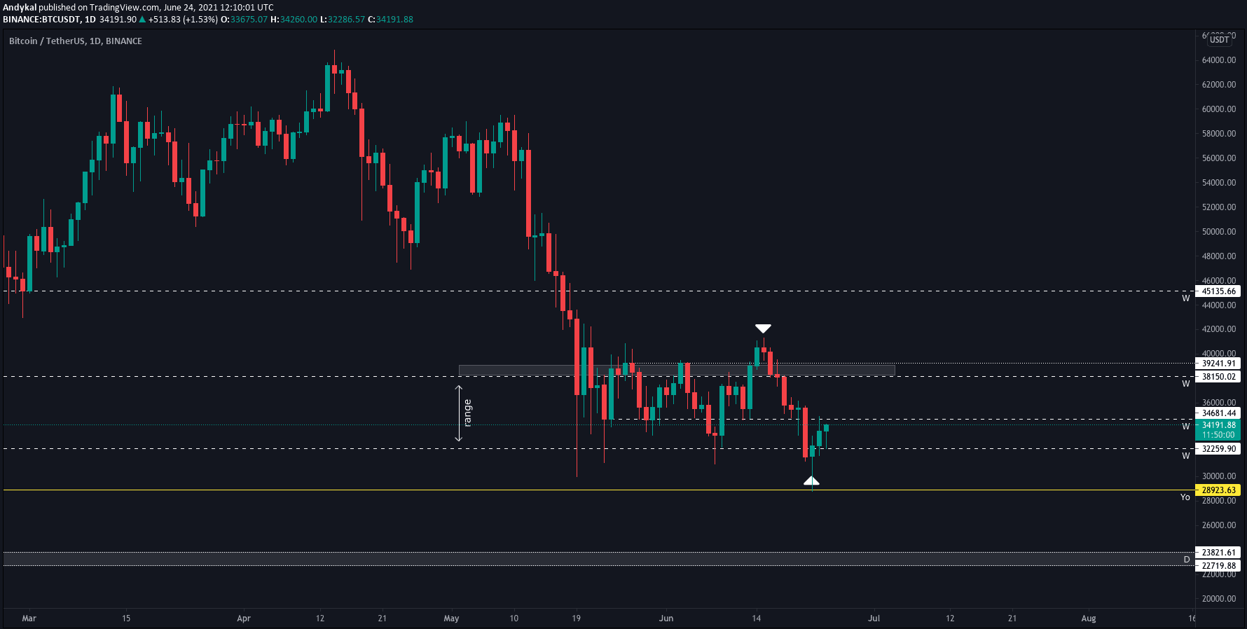 Tím se situace ještě více znejasňuje. Pokud bych měl určit jeden důležitý level, který bude odpovídat za kaskádu dalších reakcí, pak je to zcela jistě cena 34 700 USD, která působí jako pivot mezi tím, zda Bitcoin opravdu jen udělal odchylku dolů, nebo to byl první trendový pohyb a uvidíme ceny kolem 24 tis. USD.
