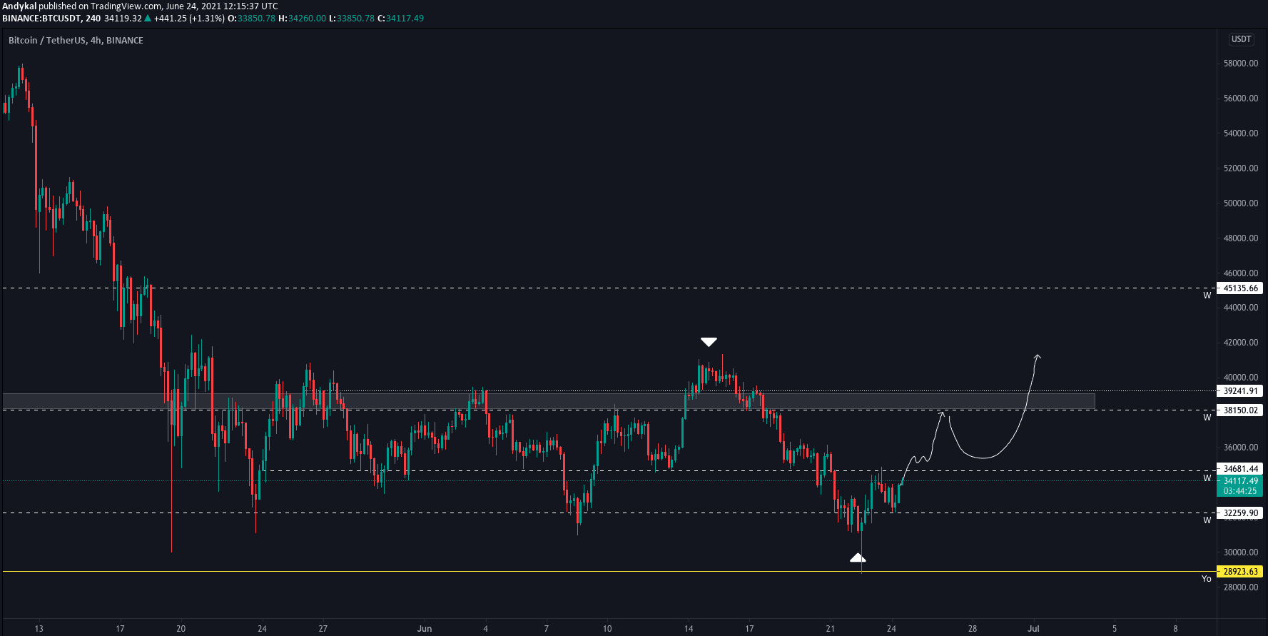 Úroveň, která by nám to všechno měla rozseknout, jsou ceny kolem 34 700 USD. Pokud Bitcoin dokáže tuto úroveň překonat, velmi pravděpodobně jdeme na otestování range high, tedy 38 000 USD a postupně velmi pravděpodobně i 45 000 USD, o kterých jsme se bavili v minulých analýzách, že další velký pohyb povede právě sem.