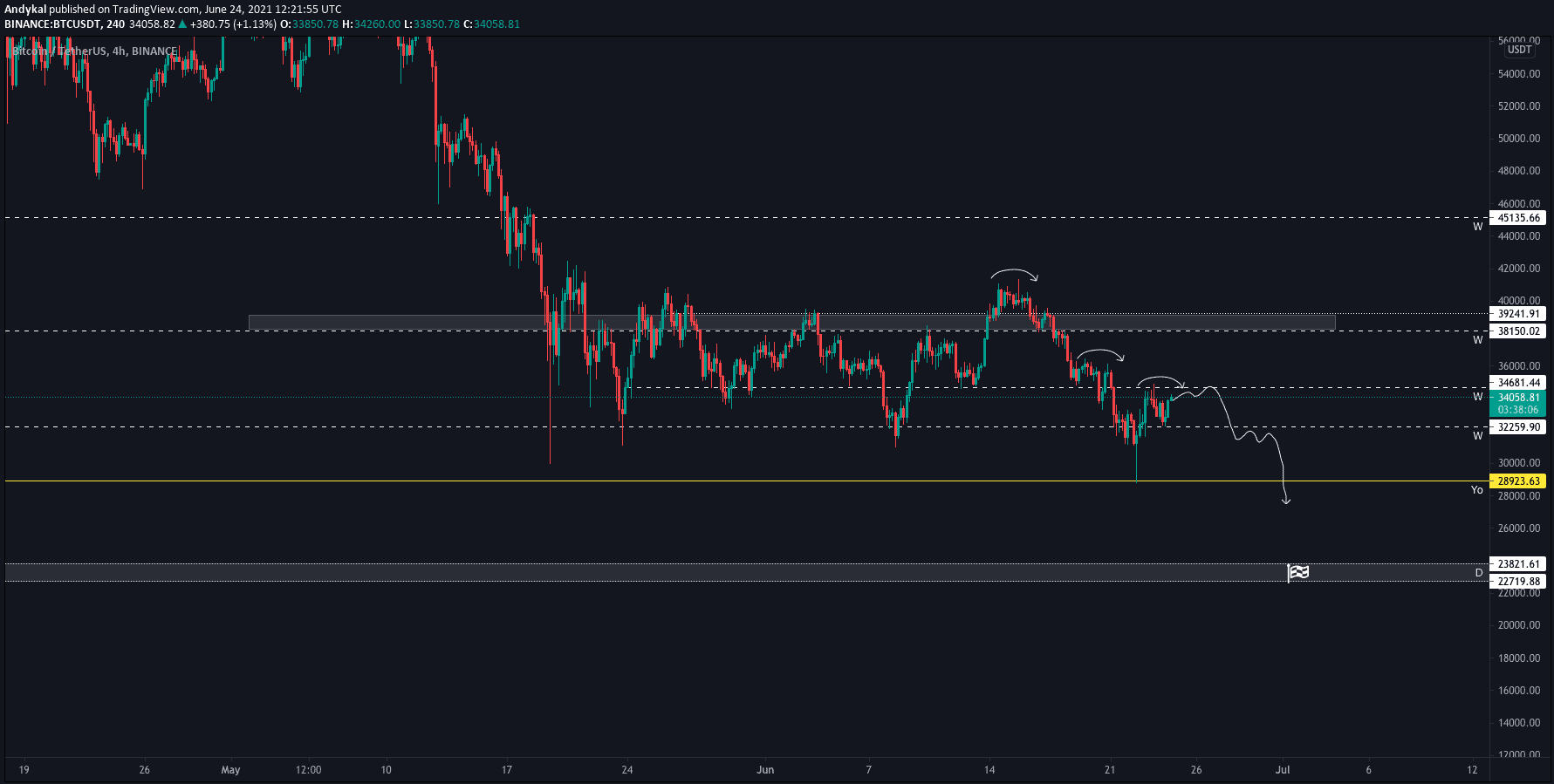 Zmíněné ceny kolem 35 tis. USD jsou nyní tou nejdůležitější rezistencí. Pokud ji tedy nedokáže BTC překonat, je možné, že BTC vytvoří nižší high a může pokračovat dolů, k 24 tis. USD, kde by byla další důležitá zastávka.