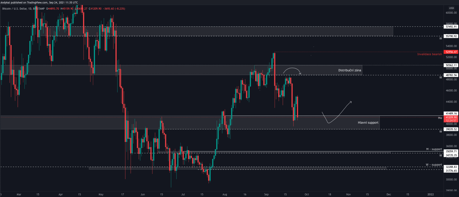 Ahoj tradeři, v minulé analýze jsme se bavili o tom, že kolem 49.000 USD je hlavní rezistence, která by měla poslat BTC na nejbližší support, kterým byly ceny 41.500-39.000 USD. Toto proběhlo naprosto ukázkově – níže můžete vidět graf s analýzou z minulého týdne.